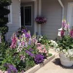 This year is in tribute to Gregg’s mom, Rosie Deems. She was an avid gardener who enjoyed flowers –especially roses. Enter through an arch of pink Eden roses and a white picket fence covered with Iceberg and Somebreuil roses. A curved walkway leads to a water fountain and a colorful display of hollyhocks, foxgloves, delphiniums, camellias, and impatiens flanking the front door. The pergola provides a lovely view of the rose and iris gardens.
