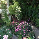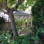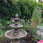 As you stroll toward the gardens in the back you pass a climbing white Eden rose, camellias, dahlias, larkspur, and cup and saucer and other colorful perennials. Continue to walk into the side yard and pass through another rose covered arbor near a bed of iris and alstroemeria. A favorite place where hummingbirds flutter on their way to visit the stephanotis at the water feature. If you linger near the fuchsia baskets, a deep breath will bring you the delicate fragrance of sweet peas. The covered patio is ready to entertain and overlooks the centerpiece of the rose garden–a three tiered fountain with two sweet pea towers. Feel free to travel the path shaded by a large avocado tree and discover the gazebo and many other flowers to treat your camera to.