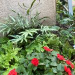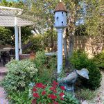 Please keep your eyes open for the large family of hummingbirds who enjoy feasting on a wide variety of everblooming red flowers. You may also glimpse a pair of pin-tailed whydahs, an occasional hawk, and several types of finches congregating around a birdbath and small fountain. Well camouflaged dinosaurs have also been spotted munching on the greenery.